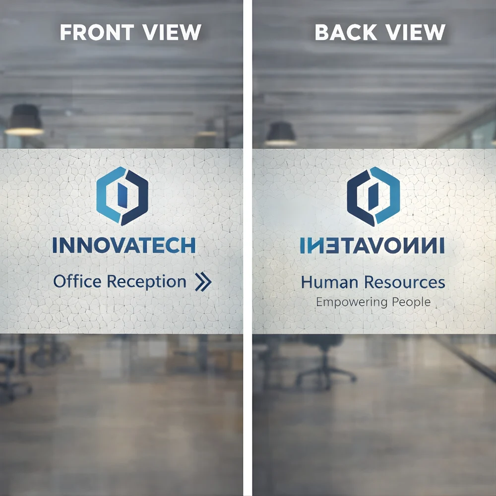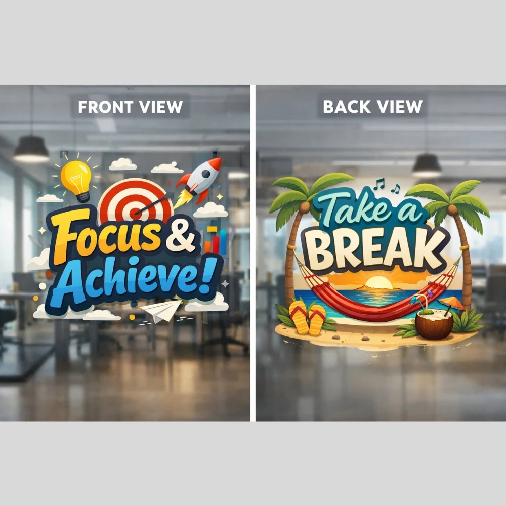 Double-sided glass stickers are printed with two designs back-to-back, allowing different or identical artwork to be seen from both sides of the glass. Therefore, they are ideal for shopfronts, office windows, and glass doors where visibility matters from every angle.
